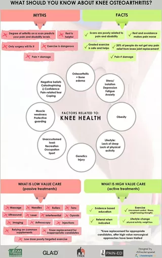 Reference: Caneiro JP, O’Sullivan PB, Roos EM, et al. Three steps to changing the narrative about knee osteoarthritis care: a call to action. British Journal of Sports Medicine. 2019. https://bjsm.bmj.com/content/early/2019/09/03/bjsports-2019-101328.